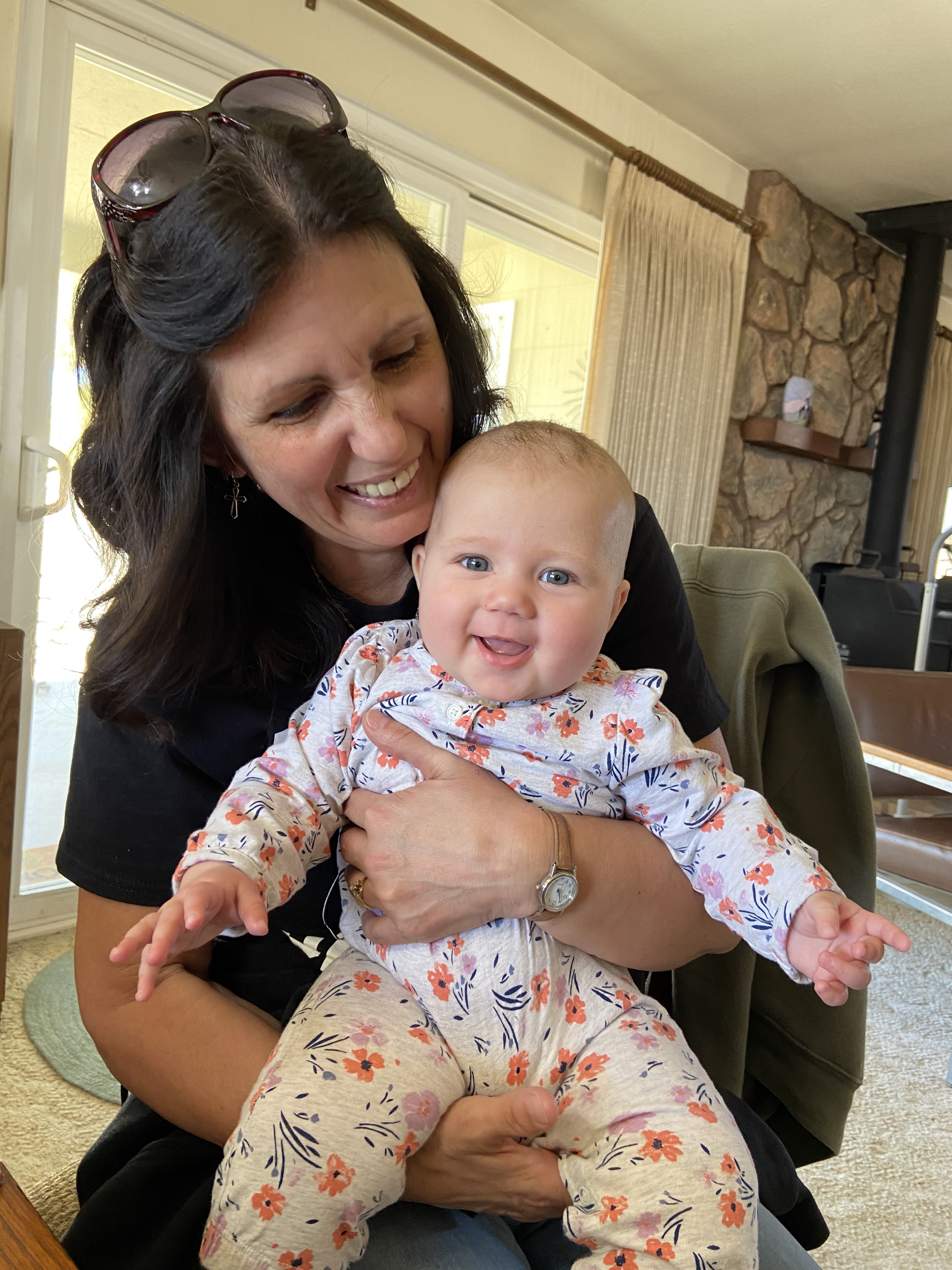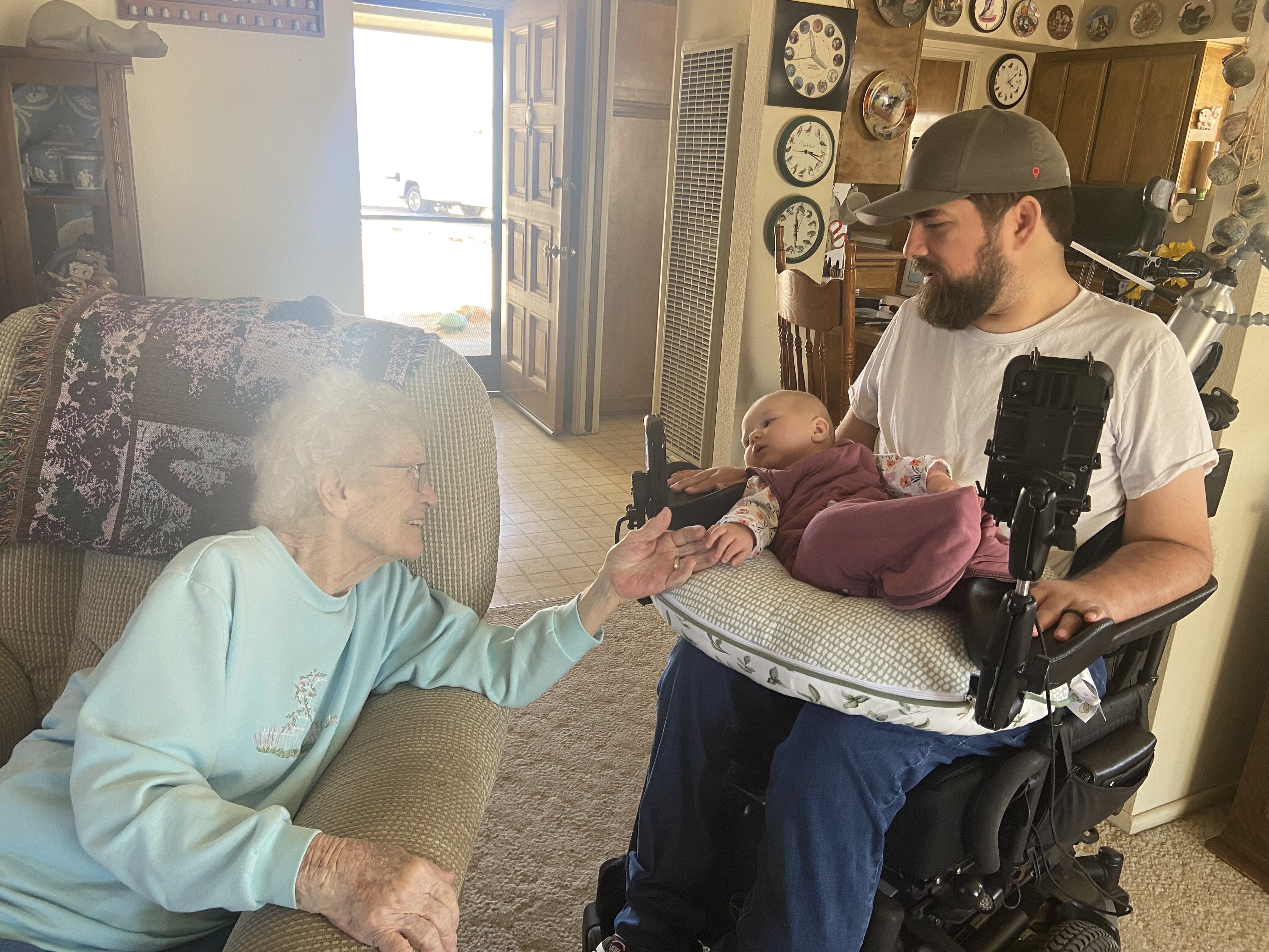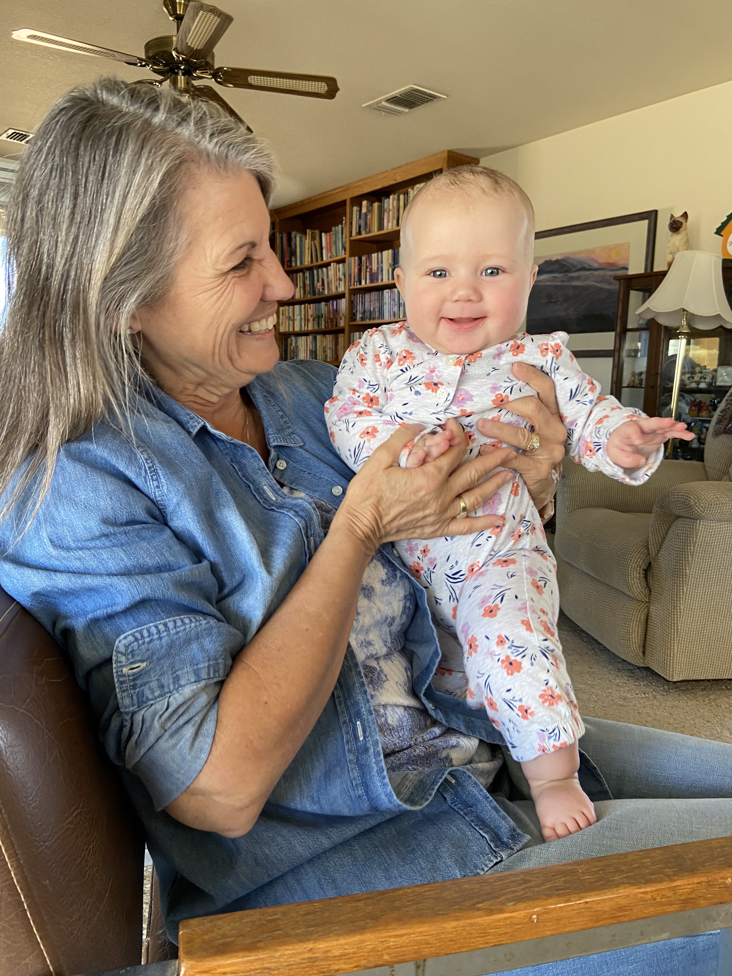 After a brief stop in Barstow to connect with Elizabeth, a local quad wife Claire had met through the WAGSofSCI, we powered through some heavy gusts to get to Twentynine Palms. All that was left was a couple of turns through town to get to the bumpy dirt road that is Indian Trail. We vibrated our way down the path to find our favorite 95-year-old patiently on the porch to welcome us. Though macular degeneration has robbed her of her eyesight, her razor wit and encyclopedic memory remain intact. She could barely wait to get the baby with her name onto her lap.
